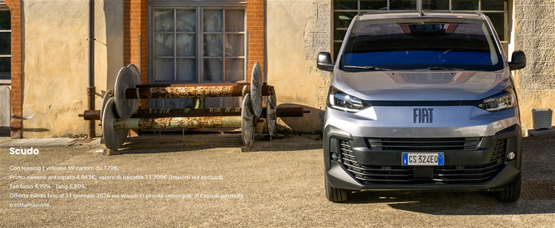 DETTAGLIO PROMOZIONE: Es. di leasing finanziario Evolease su SCUDO VAN M 1.5 Diesel 120cv Manuale: Prezzo di Listino 29.200 € (Messa su strada, IPT e contributo PFU esclusi), Prezzo Promo 21.750 €. Valore fornitura 21.750 €: Primo canone anticipato 4.843 €, durata 60 mesi; 59 canoni mensili da 179 € (incluse spese di gestione di 15,72 € /canone ed il servizio Identicar 12 mesi per un importo mensile del servizio 3,7 € /canone, Messa su strada e contributo PFU esclusi). Valore di riscatto 11.709,2 €. Importo Totale del Credito 17.462,57 € Spese Istruttoria 0€. Bollo 16 €. Spese invio rendiconto periodico cartaceo: 0 €/anno. Interessi Totali 3.661,85€. Importo Totale Dovuto 25.411,85€ (escluso anticipo e comprensivo dell'eventuale Valore di Riscatto). Solo in caso di restituzione e/o sostituzione del veicolo alla scadenza contrattualmente prevista, verrà addebitato un costo pari a 0,05 €/km ove il veicolo abbia superato il chilometraggio massimo di 100.000 km. TAN (fisso) 4,99%, TAEG 6,8%. Tutti gli importi sono indicati al netto di IVA (ove prevista). Offerta riservata ai titolari di Partita IVA sui veicoli in pronta consegna, in caso di permuta o rottamazione usato per contratti stipulati entro il 31 gennaio 2026, non cumulabile con altre iniziative in corso. Offerta Stellantis Financial Services Italia S.p.A. soggetta ad approvazione. Documentazione precontrattuale bancaria/assicurativa in concessionaria e sul sito www.stellantis-financial-services.it (Sez. Trasparenza). Messaggio Pubblicitario con finalità promozionale