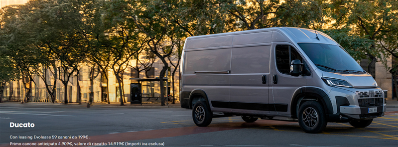 DETTAGLIO PROMOZIONE: Es. di leasing finanziario Evolease su DUCATO FURGONE LASTRATO 30Q MH1 120CV 2.2 Multijet 3 E6E: Prezzo di Listino 33.600 € (Messa su strada, IPT e contributo PFU esclusi), Prezzo Promo 25.200 €. Valore fornitura 25.200 €: Primo canone anticipato 4.909 €, durata 60 mesi; 59 canoni mensili da 199 € (incluse spese di gestione di 18,76 € /canone ed il servizio Identicar 12 mesi per un importo mensile del servizio 3,7 € /canone, Messa su strada e contributo PFU esclusi). Valore di riscatto 14.918,4 €. Importo Totale del Credito 20.849,44 € Spese Istruttoria 0€. Bollo 16 €. Spese invio rendiconto periodico cartaceo: 0 €/anno. Interessi Totali 4.484,23€. Importo Totale Dovuto 29.684,23€ (escluso anticipo e comprensivo dell'eventuale Valore di Riscatto). Solo in caso di restituzione e/o sostituzione del veicolo alla scadenza contrattualmente prevista, verrà addebitato un costo pari a 0,05 €/km ove il veicolo abbia superato il chilometraggio massimo di 100.000 km. TAN (fisso) 4,99%, TAEG 6,7%. Tutti gli importi sono indicati al netto di IVA (ove prevista). Offerta riservata ai titolari di Partita IVA in caso di permuta o rottamazione usato per contratti stipulati entro il 31 ottobre 2025, non cumulabile con altre iniziative in corso. Offerta Stellantis Financial Services Italia S.p.A. soggetta ad approvazione. Documentazione precontrattuale bancaria/assicurativa in concessionaria e sul sito www.stellantis-financial-services.it (Sez. Trasparenza). Messaggio Pubblicitario con finalità promozionale