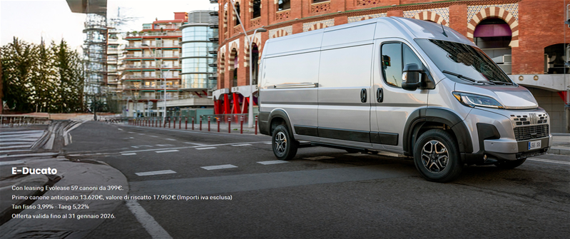 DETTAGLIO PROMOZIONE: Es. di leasing finanziario Evolease su DUCATO FURGONE LASTRATO 35 L3H2 270CV - 205 kW: Prezzo di Listino 54.900 € (Messa su strada, IPT e contributo PFU esclusi) Prezzo Promo 47.800 €. Valore fornitura 47.800 €: Primo canone anticipato 13.620 €, durata 60 mesi; 59 canoni mensili da 399 € (incluse spese di gestione di 20,84 € /canone ed il servizio Identicar 12 mesi per un importo mensile del servizio 3,7 € /canone, Messa su strada e contributo PFU esclusi). Valore di riscatto 17.952,3 €. Importo Totale del Credito 34.740,82 € Spese Istruttoria 0€. Bollo 16 €. Spese invio rendiconto periodico cartaceo: 0 €/anno. Interessi Totali 5.304,03€. Importo Totale Dovuto 53.104,03€ (escluso anticipo e comprensivo dell'eventuale Valore di Riscatto). Solo in caso di restituzione e/o sostituzione del veicolo alla scadenza contrattualmente prevista, verrà addebitato un costo pari a 0,05 €/km ove il veicolo abbia superato il chilometraggio massimo di 100.000 km. TAN (fisso) 3,99%, TAEG 5,22%. Tutti gli importi sono indicati al netto di IVA (ove prevista). Offerta riservata ai titolari di Partita IVA per contratti stipulati entro il 31 gennaio 2026, non cumulabile con altre iniziative in corso. Offerta Stellantis Financial Services Italia S.p.A. soggetta ad approvazione. Documentazione precontrattuale bancaria/assicurativa in concessionaria e sul sito www.stellantis-financial-services.it (Sez. Trasparenza). Messaggio Pubblicitario con finalità promozionale