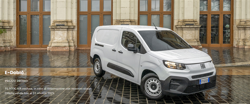DETTAGLIO PROMOZIONE: es. promozione con applicazione incentivi statali su DOBLO' Van BEV CH1: Prezzo di Listino 31.600 € (Messa su strada, IPT e contributo PFU esclusi), Prezzo Promo con applicazione incentivi statali 15.500 €. Il dettaglio degli incentivi statali è consultabile nel Decreto Ministeriale “8 Agosto 2025” («Programma di rinnovo del parco veicoli privati e commerciali leggeri con veicoli elettrici») pubblicato sulla G.U. del 8/9/2025. Tutti gli importi sono indicati al netto di IVA (ove prevista). Offerta valida per contratti stipulati entro il 31 ottobre 2025. Messaggio Pubblicitario con finalità promozionale. Consumo di energia elettrica DOBLO' Van BEV CH1 (kWh/100 km): 19,6; emissioni CO2 (g/km): 0. Valori omologati in base al ciclo misto WLTP aggiornati all'1/12/2024 e indicati a fini comparativi. I valori effettivi di consumo di carburante ed energia e autonomia elettrica ed emissioni di CO2 possono variare in base alle condizioni d’uso e a vari fattori.