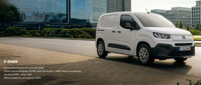 DETTAGLIO PROMOZIONE: Es. di leasing finanziario Evolease su DOBLO' VAN M Elettrico 100kW: Prezzo di Listino 31.600 € (Messa su strada, IPT e contributo PFU esclusi), Prezzo Promo 25.000 €. Valore fornitura 25.000 €: Primo canone anticipato 9.879 €, durata 60 mesi; 59 canoni mensili da 209 € (incluse spese di gestione di 14,11 € /canone ed il servizio Identicar 12 mesi per un importo mensile del servizio 3,7 € /canone, Messa su strada e contributo PFU esclusi). Valore di riscatto 7.299,6 €. Importo Totale del Credito 15.675,26 € Spese Istruttoria 0€. Bollo 16 €. Spese invio rendiconto periodico cartaceo: 0 €/anno. Interessi Totali 2.904,55€. Importo Totale Dovuto 27.904,55€ (escluso anticipo e comprensivo dell'eventuale Valore di Riscatto). Solo in caso di restituzione e/o sostituzione del veicolo alla scadenza contrattualmente prevista, verrà addebitato un costo pari a 0,05 €/km ove il veicolo abbia superato il chilometraggio massimo di 100.000 km. TAN (fisso) 4,99%, TAEG 7,05%. Tutti gli importi sono indicati al netto di IVA (ove prevista). Offerta riservata ai titolari di Partita IVA per contratti stipulati entro il 31 gennaio 2026, non cumulabile con altre iniziative in corso. Offerta Stellantis Financial Services Italia S.p.A. soggetta ad approvazione. Documentazione precontrattuale bancaria/assicurativa in concessionaria e sul sito www.stellantis-financial-services.it (Sez. Trasparenza). Messaggio Pubblicitario con finalità promozionale